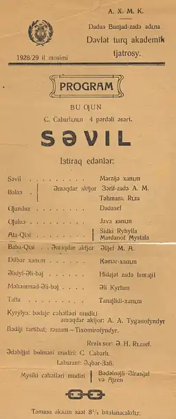 Sevil es una obra de teatro del dramaturgo azerbaiyano Yafar Yabbarlí escrita en 1928. La obra se centra en el tema del papel de la mujer, su opresión, lucha y, en última instancia, su victoria sobre las tradiciones patriarcales obsoletas de la sociedad azerbaiyana de la época.[1][2][3] Muchas mujeres se negaron a usar el hijab después de ver esta obra.[4]
