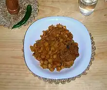 El 'carne picada' o pan plano se hace con sémola fina y, tras cocerlo, se corta a mano en trozos pequeños. Cuando se come en platos individuales, se ponen unos dos puñados en cada uno y entonces se vierte encima la salsa o estofado.