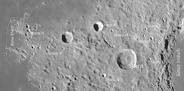 Por convención estos elementos son identificados en los mapas lunares poniendo la letra en el lado del punto medio del cráter que está más cercano a Sharp.