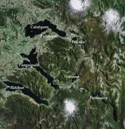 - lago Neltume, de 9,5 km², que drena a través de río Fuy en el lago Panguipulli;