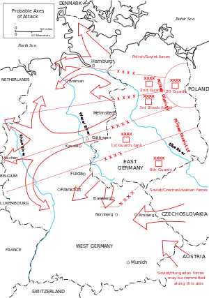 ![]() Un mapa de 1976 de probables ejes de ataque de las fuerzas del Pacto de Varsovia en Europa Occidental | ||||