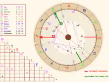 - A través de los aspectos que otros planetas hacen al regente y al mismo ascendente. El punto de corte del ascendente con la elíptica se convierte en uno de los llamados puntos sensibles. Son sumamente importantes aquellos planetas que hacen con el ascendente aspectos mayores y, principalmente, los que hacen conjunción con el mismo, puesto que muchos astrólogos entienden que sus características destacarán de forma muy visible en la personalidad y en el físico del recién nacido.[3] Esta cercanía al ascendente incluye no solo aquellos planetas que se encuentran en el área de la Casa I (bajo el Horizonte), sino también a los que están a 10° de distancia dentro de la Casa XII (es decir, por encima del Horizonte).