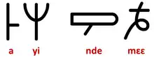 Se compone de 195 símbolos y se escribe de derecha a izquierda. Los primeros 42 caracteres se usan como en un alfasilabario, pero los 150 restantes como un silabario simple.