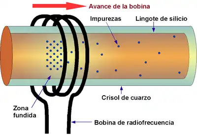 La fusión por zonas es un método usado para que el silicio monocristalino crezca con concentración de impurezas más bajas de las que se obtenían en el método Czochralski, y es que en el proceso de CZ se utilizaba para sustratos comerciales. En las obleas había una gran ración de oxígeno. Causas que llegaban a provocar el oxígeno por su impureza era reducir en las células solares su vida útil por lo que reducía así mismo también la corriente, eficiencia y ventajas, además que las obleas al ser sensitivas a temperaturas altas generaba un problema con el oxígeno que actuaba a altas temperaturas con otros elementos. Para poder arreglar todas estas dificultades se usan las obleas de zona flotante.[2] Se sostiene de manera vertical una varilla Policristalina (Ejemplo Silicio) en un inductor de pocos mm de diámetro mientras se funde lentamente. Por debajo del inductor se genera un Monocristal de alta pureza. Las varillas giran en contra de las agujas del reloj y no tiene contacto con otros materiales o crisoles. El nuevo cristal tiene un diámetro de 200 mm, debido a su alta pureza estos cristales se utilizan como semiconductores.