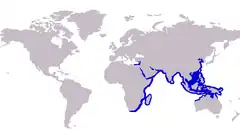 Se encuentra desde el Mar Rojo hasta Sudáfrica, Japón, Australia y Nueva Caledonia. También presente en el Mediterráneo (Turquía ).