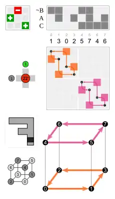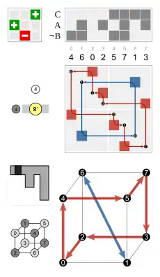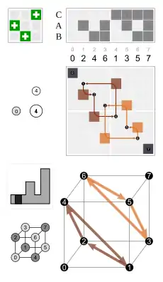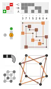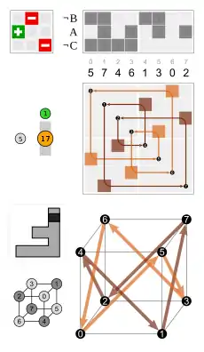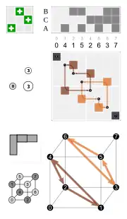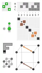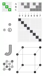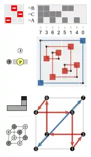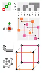- Por las caras, tres caras adyacentes dadas (por ejemplo, 1, 2 y 3 que se asignan en un dado)