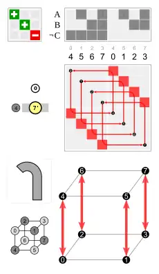 - Por una permutación de las cuatro diagonales del cuerpo (cada una de las 24 permutaciones es posible), combinada con una clave para determinar la inversión del cubo, o no