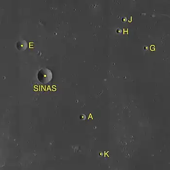 Por convención estos elementos son identificados en los mapas lunares poniendo la letra en el lado del punto medio del cráter que está más cercano a Sinas. Sinas A yace al sureste, con Sinas E al noroeste, a una distancia más corta. Sinas G, H y J aparecen al este-noreste, a mayor distancia, y Sinas K se halla más al sureste.