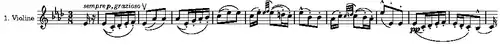 El desarrollo posterior del tema adquiere características de marcha, que se derivan de la segunda parte del tema. Un fraseo lírico posterior bien puede caracterizarse como un segundo tema, que termina en un clímax dramático en do menor. A esto le sigue la repetición de la exposición, en la que aparece una idea coral en estilo de marcha. En lo siguiente, domina un estado de ánimo tenso e indefinido, que sigue teniendo un efecto amenazante debido a las cuerdas graves. Sólo la entonación del contratema lírico en piano es capaz de resolver un poco esta tensión. Sin embargo, los eventos musicales no pierden del todo su tensa espera. Un motivo en la madera completa el segundo tema. Las figuras en movimiento de las cuerdas graves en el acompañamiento, que regresan después de un tiempo, desencadenan una dinámica que lentamente llega a un clímax. Unos pocos acordes de trompeta conducen de nuevo a un estado de ánimo lírico, la tensión se ha disuelto un poco más. Sin embargo, unos momentos después, regresa al comienzo. El fraseo de la cuerda da lugar a una breve protesta de la orquesta en forte. Sin embargo, con la misma brusquedad, este estado de ánimo se disuelve nuevamente y conduce a un breve punto de descanso. A partir de esto, se desarrolla una dinámica de avance. Un proceso que se repite a menudo y en cuyo clímax se presenta con júbilo el tema principal antes de que la tensión se acumule en el drama supremo y en el tutti de la orquesta. El carácter de marcha se afirma cada vez más en este momento, lo que hace que la música parezca a veces militar. El clímax del movimiento se alcanza en un acorde disonante repetidamente repetido en el tutti orquestal y significa el colapso del evento. Ahora comienza una parte a modo de recapitulación con el motivo de las cuerdas bajas. Un motivo descendente y amenazante en las cuerdas anuncia la coda, tras la cual se expone la idea de una marcha en los instrumentos de viento. El conocido impulso hacia adelante aparece de nuevo, pero no encuentra una salida real y colapsa en un desmayo. Unos pocos acordes de viento terminan el movimiento, acompañados por las figuras inquietas de las cuerdas graves y los redobles de tambor, antes de que una escala orquestal cromáticamente descendente haga que la acción se derrumbe por última vez.