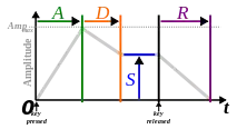 Cuando un instrumento musical acústico produce un sonido, el volumen y el contenido espectral de dicho sonido cambia a través del tiempo de maneras que varían de instrumento a instrumento. El "attack" (ataque) y "decay" (decaimiento) de un sonido tienen un gran efecto sobre las cualidades sonoras de un instrumento.[66] Las técnicas de síntesis de sonido comúnmente emplean un "generador de envolventes" que controla los parámetros del sonido en diferentes puntos de su duración. Se la emplea en la llamada envolvente ADSR (Attack Decay Sustain Release), la cual puede ser aplicada al control de la amplitud, como filtro de frecuencias, etc. La envolvente puede ser un circuito discreto o un módulo que está implementado en un software. El comportamiento de una envolvente de ADSR está especificado a través de cuatro parámetros:
