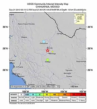 ![]() Intensidades del sismo en mapa ZIP Map M 5.4 - 20km WSW of Naica, México.[1] | ||