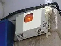 - Sirena exterior: es el elemento más visible desde el exterior del inmueble protegido. Se trata de una sirena con autonomía propia (puede funcionar aun si se le corta el suministro de corriente alterna o si se pierde la comunicación con la central procesadora) colocada dentro de un gabinete protector (de metal, policarbonato, etc.). Puede tener además diferentes sistemas luminosos que funcionan en conjunto con la disuasión sonora. La sirena exterior es opcional y en algunos sitios desaconsejada, en cambio la sirena interior resulta obligatoria de acuerdo con las normas europeas y americanas.