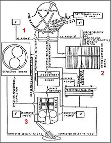 Las direcciones resultantes, conocidas como solución de disparo, se enviarían luego a las torretas para su colocación. Si las balas fallaban, un observador podría calcular hasta qué punto fallaron y en qué dirección, y esta información podría devolverse a la computadora junto con cualquier cambio en el resto de la información e intentar otro disparo.