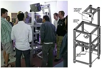 El difusor holográfico anisotrópico y el espejo están montados en un panel de fibra de carbono y conectado a un volante de inercia de aluminio de 45 grados. El volante gira en sincronía con respecto a las imágenes mostradas por el proyector.