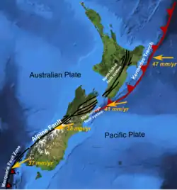 El sistema de fallas de Marlborough se compone de cuatro ramales principales de fallas de deslizamiento, que en conjunto transportan casi todo el desplazamiento asociado al límite de placas. Otras fallas más pequeñas se forman como ramificaciones de estas fallas principales o acomodan la deformación de la corteza entre ellas, como las fallas Newton y Hura en el extremo occidental de la falla Hope y el cabalgamiento Jordan que formó la cordillera Seaward Kaikoura. El deslizamiento dextral a través de esta zona también ha implicado una rotación de los bloques de falla intermedios en el sentido de las agujas del reloj de unos 20° desde el Plioceno temprano.[2]