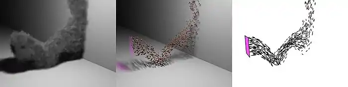 Las partículas son inicialmente sólo elementos lógicos (a la derecha de la imagen), a las que se debe otorgar propiedades gráficas para que sean visibles. Por ejemplo, cada partícula se puede sustituir por un objeto geométrico, gracias a lo cual es posible mostrar enjambres o campos de asteroides (en el centro de la imagen). Con la adición del material correspondiente se pueden utilizar sistemas de partículas para mostrar humo, niebla o fuego (a la izquierda).