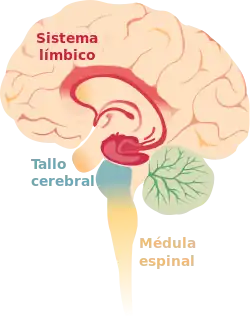 El sistema límbico es un sistema filogenéticamente antiguo formado por varias estructuras cerebrales complejas que se ubican alrededor del tálamo y por debajo de la corteza cerebral. Es el principal responsable de la vida afectiva.[1] En la actualidad se sabe que el sistema límbico está involucrado, junto con otras estructuras más allá de sus límites, en la formación de la memoria, el control de las emociones, las motivaciones, diversos aspectos de la conducta, la iniciativa, la supervivencia del individuo y el aprendizaje.[1] Desde el punto de vista funcional, integra estructuras como la circunvolución cingular, la cisura longitudinal, el septo, el cuerpo mamilar del hipotálamo, el fórnix, el hipotálamo, la amígdala cerebral y el hipocampo.[2][3]