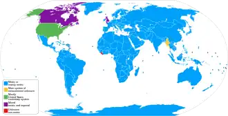 Con el tiempo, los distintos países fueron adoptando el sistema, ya en su versión Sistema Internacional de Unidades. Únicamente no lo ha adoptado oficialmente Estados Unidos. Tanto Liberia como Birmania utilizaban otros sistemas pero sus respectivos gobiernos han iniciado la adopción cada vez más amplia del sistema métrico. El comercio internacional lo realizan en unidades métricas al igual que gran parte del comercio interno, abandonando así el viejo sistema.[32][33]Pese a que Estados Unidos no ha adoptado oficialmente el sistema métrico —cuyo uso es legal en el país desde 1866—, este se enseña en muchas escuelas y se ha ido implantando de forma voluntaria en muchas áreas, como en el campo de la ciencia, la tecnología y parte de la industria manufacturera, como la de los automóviles o la de la maquinaria pesada, que se pasaron al sistema métrico a partir de los años 1970.[34]