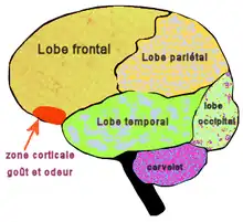 En la porción superior de la cavidad nasal, existe un área de alrededor de 5 cm² que se llama epitelio olfatorio. Esta zona contiene entre 10 y 100 millones de receptores olfatorios, cada uno de ellos es en realidad una neurona que posee cilios olfatorios sensibles a los estímulos químicos de las sustancias odorantes. Los cuerpos de estas neuronas emiten unas prolongaciones llamadas axones que se reúnen en grupos, atraviesan la lámina cribosa del etmoides y se agrupan para formar dos nervios que se conocen como nervios olfatorios. Los nervios olfatorios se aproximan al cerebro y terminan en un acúmulo de sustancia gris que se llama bulbo olfatorio. Desde el bulbo olfatorio la vía nerviosa que transporta la información odorífera continúa a través del tracto olfatorio hasta alcanzar el área olfatoria primaria de la corteza cerebral situada en el lóbulo temporal. En la corteza cerebral es donde tiene lugar la percepción consciente del olor, desde allí parten otras vías nerviosas que se comunican con el sistema límbico y el hipotálamo y son responsables de las respuestas emocionales que en muchos casos se asocian a la percepción de determinados olores. Otras vías neuronales parten del área olfatoria primaria de la corteza temporal y a través del tálamo alcanzan el lóbulo frontal. El lóbulo frontal del cerebro tiene también importantes funciones para la discriminación de los olores, por ello aquellas personas que han sufrido una lesión en dicha zona tienen dificultad para identificar los olores.[3]