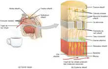 El olfato es la función sensorial que corresponde a la percepción de sustancias olorosas. Se trata de una percepción generalmente consciente, que puede solicitarse directamente (olfateando) o por vía retronasal. Esta función la proporciona la mucosa olfatoria que cubre aproximadamente el 10% o 2 cm2 de la superficie total de la cavidad nasal.[4] Las células glandulares, presentes en la mucosa y submucosa, secretan moco que recubre el epitelio olfatorio, lo que asegura un lavado permanente de la mucosa.