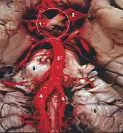 Las dos arterias vertebrales y la arteria basilar proporcionan sangre a la parte posterior del círculo arterial cerebral y se anastomosa con la parte anterior del círculo, irrigado por las arterias carótidas.