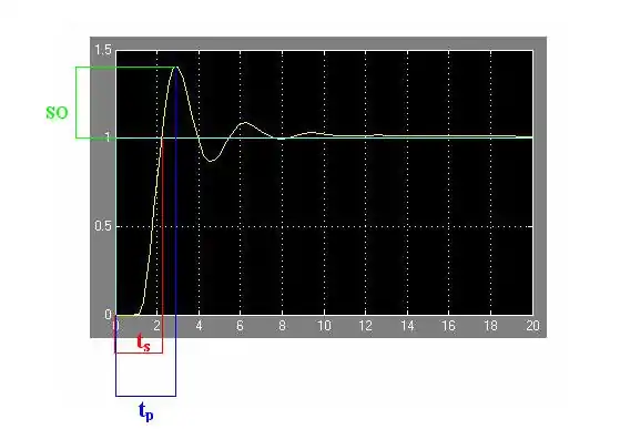 - Es el instante de tiempo en el que se produce la primera sobreoscilación en nuestro dibujo se ve representado mediante líneas azules y se denomina tp.