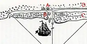![]() Detalla de un mapa de 1733 que muestra la costa de América del Norte entre Charles Town y San Agustín | ||||