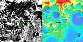 ![]() Entorno del cráter Slater (situado bajo el centro de la imagen) |