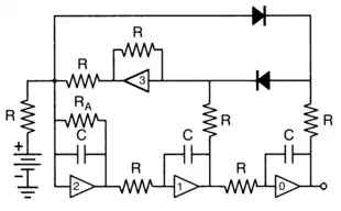 En el circuito anterior, todas las resistencias son de igual valor, excepto , y todos los condensadores son de igual capacidad. La frecuencia dominante será . La salida del Amplificador Operacional 0 corresponderá a la variable x, la salida 1 corresponderá a la primera derivada de x y la salida de 2 corresponderá a la segunda derivada.