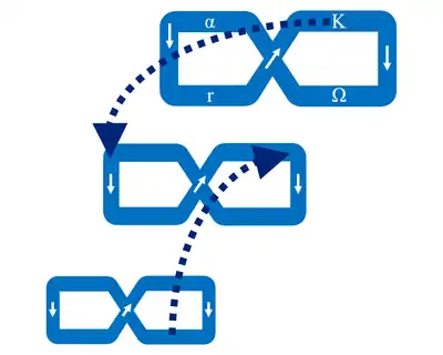 Las dos dimensiones principales que determinan cambios en un ciclo adaptativo son conectividad y potencial.[4] La conectividad es la representación visual de un ciclo y muestra la capacidad a controlar internamente su propio destino.[36] “Refleja la fuerza de conexiones internas que media y regula las influencias entre procesos internos y mundo exterior” (p. 50).[4] La dimensión potencial está representada por el eje vertical y sirve para el “potencial inherente de un sistema que está dispuesto a cambiar” (p. 393).[36] Potencial social o cultural puede ser caracterizado por las "redes acumuladas de relaciones: amistad, respeto mutuo y confianza entre personas y entre personas e instituciones de gobernanza” (p. 49).[4] Según la heurística del ciclo adaptativo, los niveles de ambas dimensiones difieren durante el curso del ciclo a lo largo de las cuatro fases. El ciclo adaptativo así pronostica que las cuatro fases del ciclo pueden ser señaladas con base en combinaciones distintas de potencial alto o bajo y en su conectividad