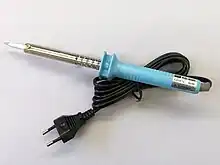Un soldador eléctrico o de estaño es una herramienta eléctrica que se utiliza para realizar soldadura blanda, es decir, con material que tiene una baja temperatura de fusión (entre 300 °C y 450 °C,), como por ejemplo el Estaño . El soldador tiene una punta de cobre que se calienta con una resistencia eléctrica, que la mantiene a una temperatura constante. Puede tener forma de martillo, punta cónica, varilla cilíndrica u otras formas, en función del uso al que esté destinado.[1]