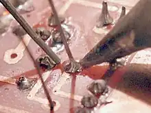 El primer soldador eléctrico tenía una punta de platino muy ligera calentada por la corriente eléctrica que circulaba por la punta.[6] En 1889, los soldadores eléctricos se estaban desarrollando con un hilo de resistencia enrollado en torno al extremo posterior de la punta de cobre y encerrado en una carcasa protectora.[7] Alternativamente, el elemento calefactor podía ponerse dentro de una punta vacía de cobre relativamente ligera.[8]