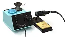 UUna estación de soldadura tiene un control de temperatura y consiste en una fuente de alimentación eléctrica, circuitos de control que permiten ajustar la temperatura con visualizador para el usuario y un soldador o cabezal de soldadura con sensor de temperatura de punta. Normalmente, la estación tiene un soporte para el soldador cuando no se utiliza y está caliente y una esponja mojada para su limpieza. Se utiliza habitualmente para soldar componentes electrónicos.