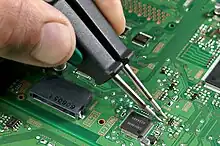• Otro tipo de sistema utiliza un termostato, a menudo dentro de la punta del soldador, que enciende y apaga automáticamente el elemento. Se puede utilizar un sensor térmico como termopar junto con circuitos para controlar la temperatura de la punta y ajustar la potencia suministrada al elemento calefactor para mantener la temperatura deseada.[16] En algunos modelos, el firmware para los circuitos de control es un software libre que puede ser modificado por el usuario final.[17][18][19]