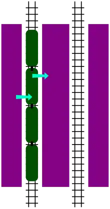 Inicialmente se planteó esta solución para que los pasajeros debieran acceder por uno de los andenes al tren (básicamente desde el andén lateral) mientras que aquellos que deseasen bajar en dicha estación debieran hacerlo a través del andén central; existe la variación de permitir el uso de ambos andenes para el embarque y desembarque simultáneo, llegando a permitir el uso de todas las puertas del tren para dichas operaciones.