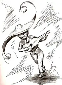 "...Cosa rara en verdad era este carbonero: pequeñísimo, vestido de negro y con un cinturón brillante que rodeaba su cuerpo menudo. Impecables botines de charol calzaban sus pies, en los aules un par de espuelas plateadas salpicaban luz en la oscuridad. Al hombro una guitarra de cajeta(...) y sobre su cabeza un enorme sombrero de alas anchas que casi lo oculta por completo."