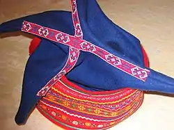 Se trata de una versión del sombrero masculino tradicional de los sami. La base es un cilindro azul, decorado con una banda roja con dibujos trenzados; pero la parte superior es una estrella grande, de cuatro puntas, de color azul brillante y con algunas partes en rojo brillante y amarillo. La decoración en el sombrero de un sami es, en la actualidad, como en el resto de su vestimenta, indicativa del lugar de origen e incluso el clan de la persona.