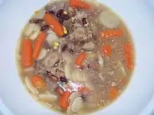 La versión china de esta sopa es más un estofado o cocido que una sopa. Se pica la carne del rabo de buey (generalmente las partes superiores del rabo resultan más carnosas y su sabor es más intenso) y las diversas verduras (zanahorias, apio, cebollas y a veces algo de cebada) y se sirve todo ello junto.