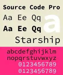 Source Code Pro es un conjunto de fuentes monosespaciadas OpenType que han sido diseñadas para funcionar bien en entornos de programación y código.[2][3][4] La familia tipográfica es un diseño complementario de la familia tipográfica Source Sans Pro.[5] Está disponible en siete pesos:(Extra-ligero, ligero, normal, mediano, seminegrita, negrita, negra).[6][7]