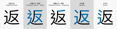 Source Han Sans tiene cinco versiones de idiomas: chino simplificado, chino tradicional de Taiwán, chino tradicional de Hong Kong, japonés y coreano.[9] Debido a las diferentes convenciones y estándares para cada una de las regiones donde se usan los idiomas, el mismo carácter en Unicode puede tener una forma diferente para cada una de las versiones de idiomas.