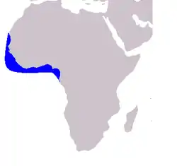 Habita en la costa atlántica africana. Su estado de conservación, según la lista roja de UICN es Crítico.