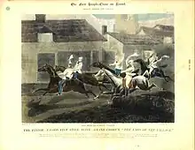 Se creía que un relato de la carrera se encontraba en la biblioteca de los O'Briens del castillo de Dromoland . La mayoría de las carreras de obstáculos anteriores se disputaron a través del campo en lugar de hacerlo en una pista, y se asemejaban al cross country inglés tal y como existe actualmente. La mayoría de las primeras carreras de obstáculos se hicieron en pistas de cross county, en lugar de una pista, y se asemejaban a las carreras de cross country inglesas que se celebran hoy.[4]La primera carrera de obstáculos registrada sobre una pista preparada con vallas se realizó en Bedford en 1810, aunque se había realizado una carrera en Newmarket en 1794 sobre una milla (1600 m) con vallas de cinco pies (1,5 m) cada cuarto de milla (400 m) y la primera steeplechase registrada de cualquier tipo en Inglaterra tuvo lugar en Leicestershire en 1792, cuando tres caballos corrieron las ocho millas desde Barkby Holt hasta Billesdon Coplow y regreso.[5]