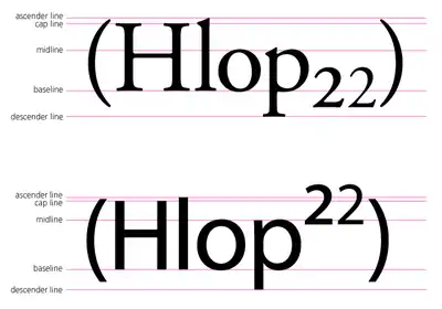 En tipografía profesional, los subíndices y superíndices no son simplemente caracteres ordinarios reducidos en tamaño; para mantenerlos visualmente similares al del resto de la tipografía, los diseños tipográficos hacen que sean ligeramente más intensos de lo que sería simplemente un carácter de tamaño reducido. Asimismo, el espacio que el texto en subíndice o superíndice se desplaza hacia arriba o hacia abajo desde la línea de base original varía según el tipo de letra y según el uso.[cita requerida]