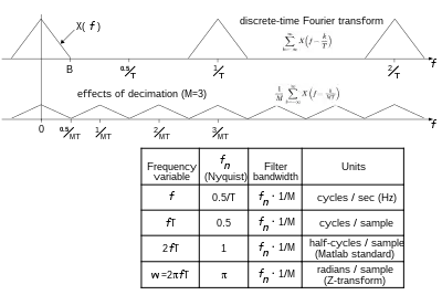 Cuándo T tiene unidades de segundos, es expresado en hercios (Hz). Reemplazando T con MT en las fórmulas anteriores da el DTFT de la secuencia diezmada, x[nM], según la ecuación: