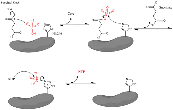 La reacción catalizada tiene lugar mediante un mecanismo de tres etapas. Se describe aquí el proceso desde succinil-CoA a succinato. Ver figura 1.
