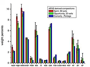 El 17 de octubre de 2012 (Curiosity rover en "Rocknest"), se realizó el primer análisis de difracción de rayos X del suelo marciano. Los resultados revelaron la presencia de varios minerales, incluidos el feldespato, los piroxenos y el olivino, y sugirieron que el suelo marciano en la muestra era similar a los "suelos basálticos erosionados" de los volcanes hawaianos.[6] La ceniza volcánica hawaiana ha sido utilizada como simulante de regolito marciano por investigadores desde 1998.[14]