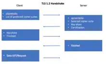 El cliente empieza el proceso enviando un mensaje clientHello (literalmente, el «hola» del cliente) al servidor que incluye la versión de TLS en uso y una lista de conjuntos de cifrados en el orden de preferencia del cliente. En respuesta, el servidor envía un mensaje serverHello (el «hola» del servidor) que incluye el conjunto de cifrados escogido y el identificador de sesión. A continuación, el servidor envía al cliente un certificado digital para verificar su identidad. El servidor también puede solicitar al cliente su certificado digital.