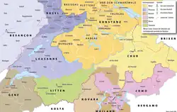 Tras un enfrentamiento en 919 en Winterthur, las potencias burgundia y suaba firmaron una paz sellada por el matrimonio del rey borgoñón Rodolfo II con la futura reina Berta, hija del duque suabo Burcardo II de Suabia (917-926) y fundadora del monasterio de Payerne y que más tarde sería considerada santa en la región de Vaud. Esa paz marcó el comienzo de un período próspero para el reino de Borgoña, que experimentó un rápido cambio demográfico, económico y arquitectónico,[Fe 9] mientras que el poder real se erosionaba gradualmente, con los obispados de Lausana, Sion y Basilea recibiendo tanto territorios como derechos soberanos del rey Rodolfo III de Borgoña (r. 993-1032). Sin heredero directo, rindió homenaje y designó como heredero en 1018 al entonces emperador Enrique II. Fue Conrado II el Sálico el que finalmente heredó, quien gracias a su matrimonio también estaba ya posesión de Suabia, pasando todo el territorio helvético al Sacro Imperio Romano Germánico.[23] Rodolfo III había entregado el Valais como feudo al obispo de Sion en 999, y cuando Burgundia y, por lo tanto, también el Valais pasaron a formar parte del Sacro Imperio, el obispo fue nombrado igualmente conde del Valais. El Arelato siguió existiendo principalmente sobre el papel a lo largo de los siglos XI al XIV, sus restos pasaron a Francia en 1378, pero sin sus partes suizas —Berna y Argovia, que en el siglo XII ya habían quedado bajo el dominio de los Zähringer y de los Habsburgo— y del condado de Saboya, que quedó separado del Arelato poco antes de su disolución, en 1361.
