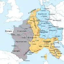 En el este, Rodolfo I se hizo elegir, en enero de 888, por un grupo de laicos y eclesiásticos en la basílica de Saint-Maurice rey de la Borgoña transjurana (r. 888-912), un reino independiente que incluía todo el conjunto de la Suiza romanda actual, Basilea, Soleura, Berna, Franco Condado y la región de Saboya con el Valle de Aosta e importantes pasos alpinos.[20][21] Tenía la capital en Saint-Maurice y en Payerne. Su hijo y sucesor, Rodolfo II (r. 912-937), adquirió en 933 el reino de Provenza (también llamado reino de la Baja Borgoña) cuando el bosónida Hugo de Arlés, rey de Italia, se lo cedió a cambio de la renuncia de Rodolfo II a la corona de Italia. Rodolfo II fundó así el reino de Arlés o Arelato, llamado asimismo segundo reino de Borgoña-Provenza, agrupando los dos reinos de la Alta y la Baja Borgoña en el nuevo reino. Alamania, por otro lado, permaneció integrada como el ducado raíz (en alemán: Stammesherzogtum, lit., 'ducado tribal') de Suabia en lo que luego se convertirá en el Sacro Imperio Romano Germánico. Burcardo I de Suabia (r. 909-911), gobernante centrado alrededor de Zúrich,[22] entró en conflicto en 911 con el conde palatino (esto es, nombrado por el rey de la Francia Oriental) Erchanger y con el obispo Salomón III de Constanza, que eran leales al rey Conrado I de Alemania. Fue capturado y acusado de alta traición y encontrado culpable por el consejo tribal que le juzgó. Ateniéndose a la ley tribal Lex Alemannorum, fue ejecutado junto con su hermano Adalberto III de Turgovia. Erchanger le sucedió en 915-917. Fue solo después de la muerte del rey, en 917, cuando los nobles locales pudieron liberarse del dominio carolingio al fundar el Ducado de Suabia.