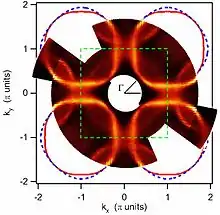 La técnica experimental más directa para resolver la estructura electrónica de cristales en la red recíproca y, consecuentemente, la superficie de Fermi, es la espectroscopía angular de efecto fotoeléctrico (ARPES por sus siglas en inglés). En la figura se muestra un ejemplo de superficie de Fermi de un cuprato semiconductor medido por ARPES.